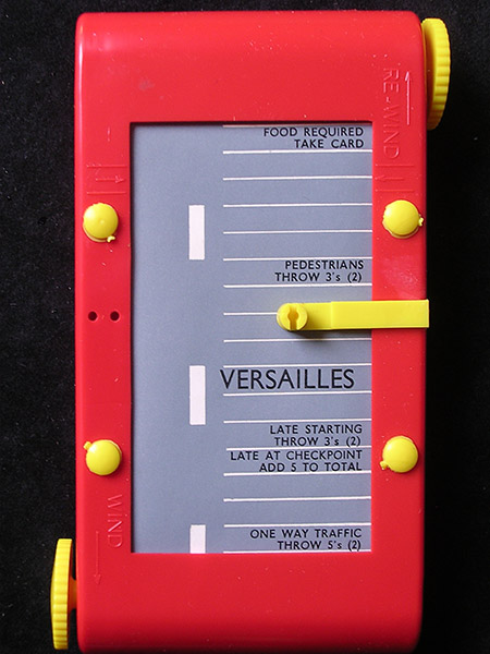 A real curiosity. In this game the board is replaced by two rolled paper bands in a plastic mechanism on which you place the riders. After the throw of the dice, you don't count squares but wind the mechanism instead.