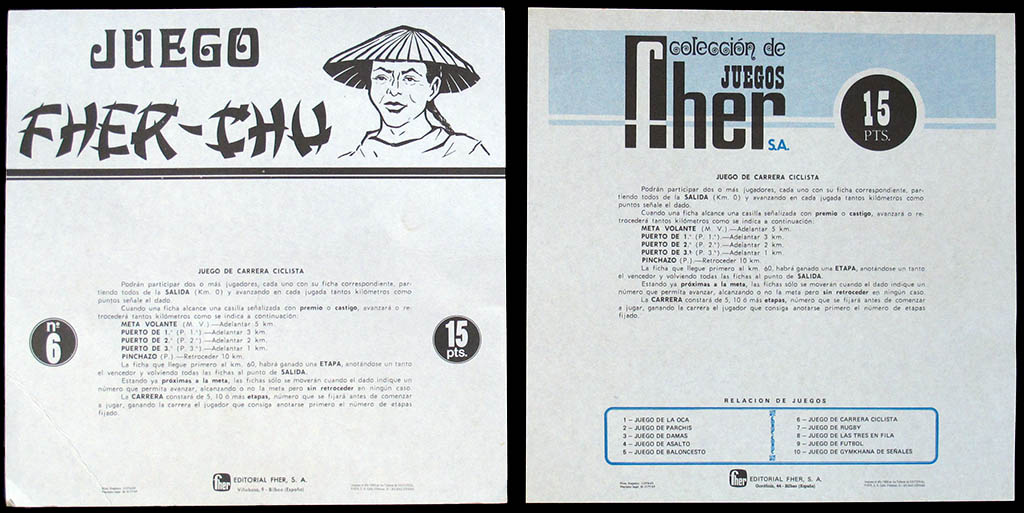 I have checked some Fher trading card albums from the 1970s and the only address I have found is Villabaso 9, but I also have found some later references to the Gordóniz address. I wonder if Fher moved its headquarters from Gordoniz to Villabaso or the other way round. In the first case the Chinese-style game would be the second edition, which would imply that the rule sheet was dropped from the games.