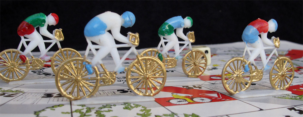 The best of the game by far is the set of four hard plastic, hand painted, riders that came with it. I had seen before similar riders in Belgium, though the ones I had seen did not have the wheels painted, if I remember well. I can't tell much about them, except that, obviously, they were not made specifically for this game.