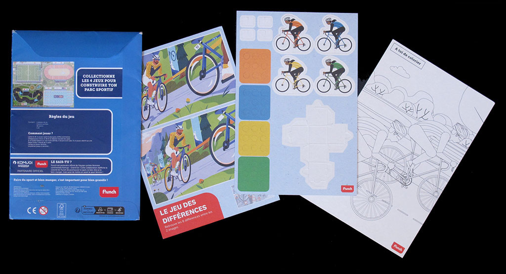 This is a small promotional game for a French chain of fast-food restaurants. It is part of a series of four sports games that, as far as I know, were given away to younger customers at some moment in 2024. Each game comes in a 21x15 cm envelope, and of course it is made of light cardboard and not meant to last. The envelope mentions three games inside, but only one of them can be considered a board game.