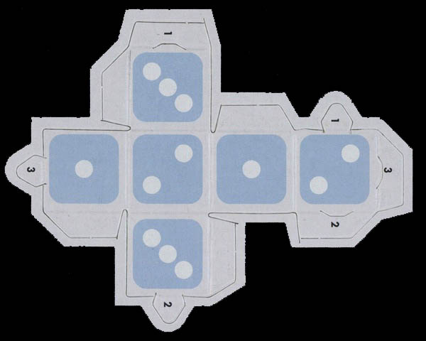 The cut-up six-sided die is marked 112233. This is convenient since the road is