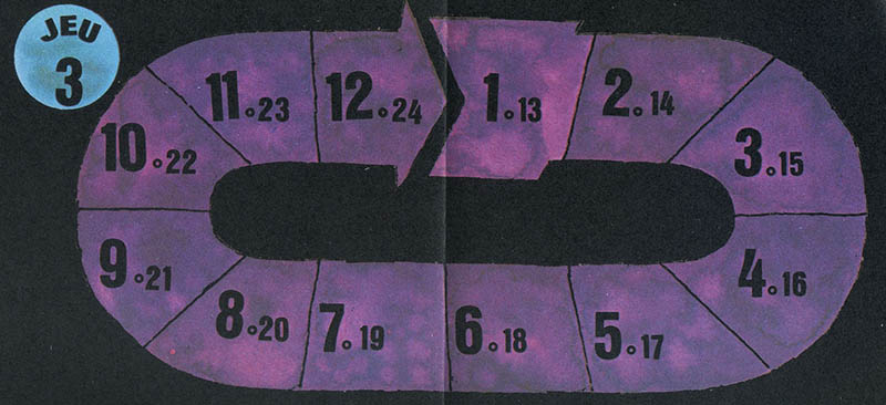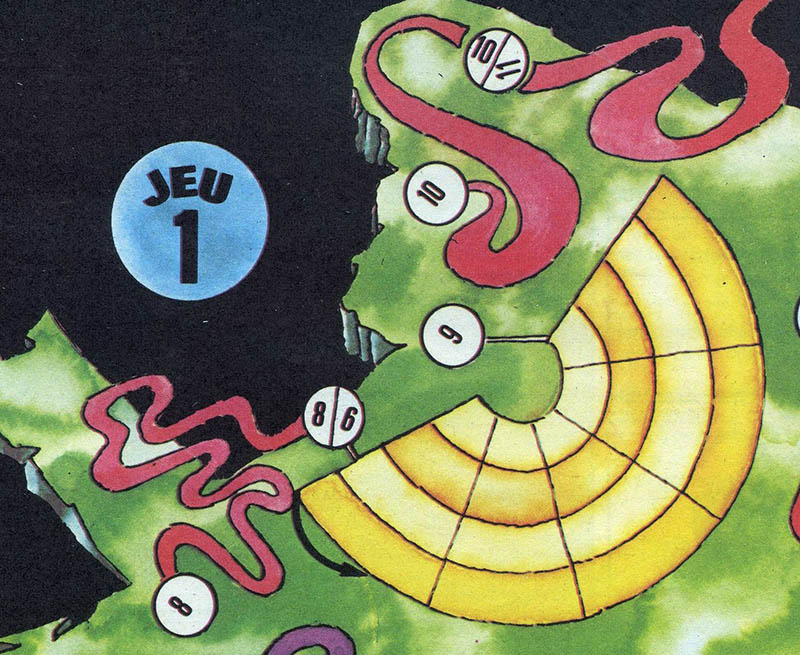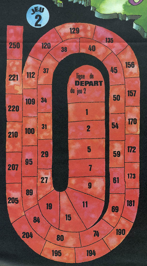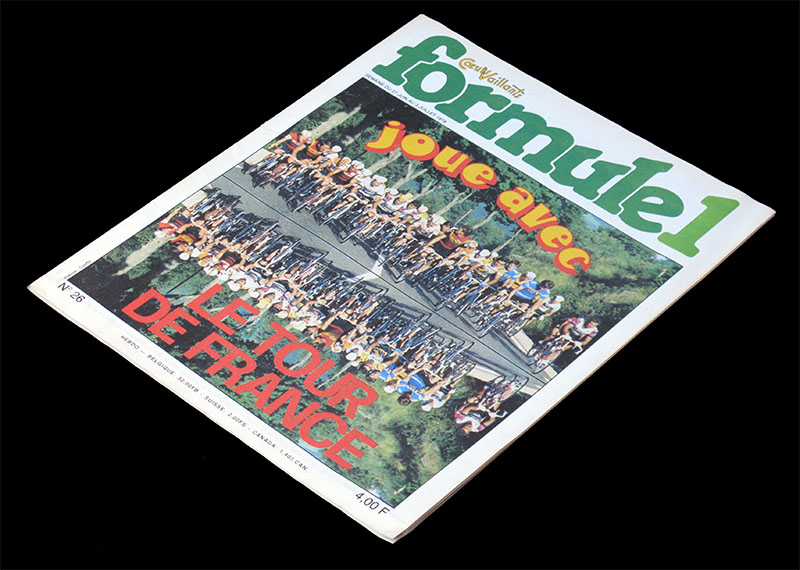 The magazine (as "Coeurs Vaillants") had already included a cycling game in 1950 and almost 30 years later they included this other game, as "Coeurs Vaillants - Formule1", on their issue n°26, june 27th to july 3rd, 1979. In this case the game is a 4-fold poster stapled to the magazine. It measures 54 x 46 cms and it features three different simple games for the different tour de France stages, indicated by the colours in the "Classement" table.