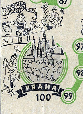 Here is a game issued for the 1954 Peace Race. It was probably issued with a newspaper or kids' magazine but, unlike this other quite similar game, there isn't any reference to the original magazine. Of course both games are chromatically similar, and at first I thought it was probably included in the Kinder-Wochenpost too. However, after having both games side by side, I am not so sure. They look less alike than in the pictures. The size is not the same and the green ink is of a different shade (or maybe it has just aged differently). Any further information will be welcome.