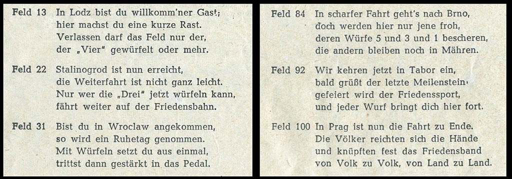As simple as the game may be, it represents a stage race game not only because it is named after one, but because stages are scored individually (and points are eventually added to determine the game winner). As you can see, the game follows the 1954 Peace Race, even offering apologies for skipping the first stage (a circuit around Warsaw, actually). It is historically relevant to notice the stage at Stalinogrod, which is the name Katowice received between March 7th 1953 and 10 December 10th 1956 (of course in honour of Joseph Stalin, leader of the Soviet Union).