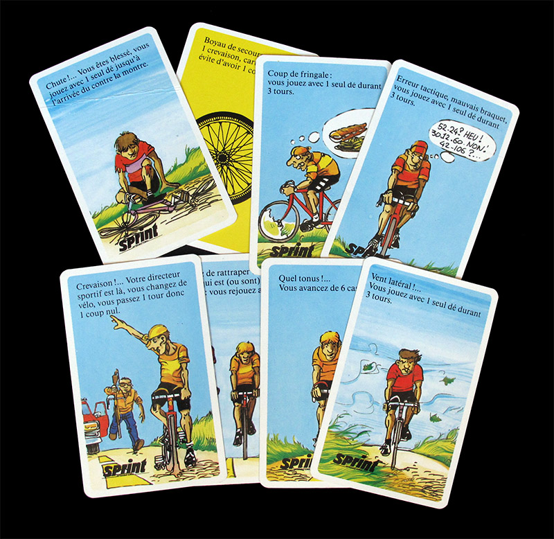 There are eleven cyclists included with the game. These are Cofalus of the type usual in the eighties (smaller than the later ones we find in some nineties' games). Apart from the eight riders needed to play the game (two for each of the four teams) we have one with the yellow jersey, one with the green jersey and one with the polka-dot jersey, which are supposed to be replace the leaders of the general, points and mountain classifications from the second stage on.