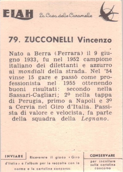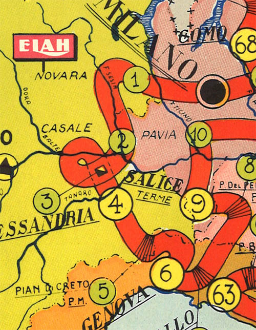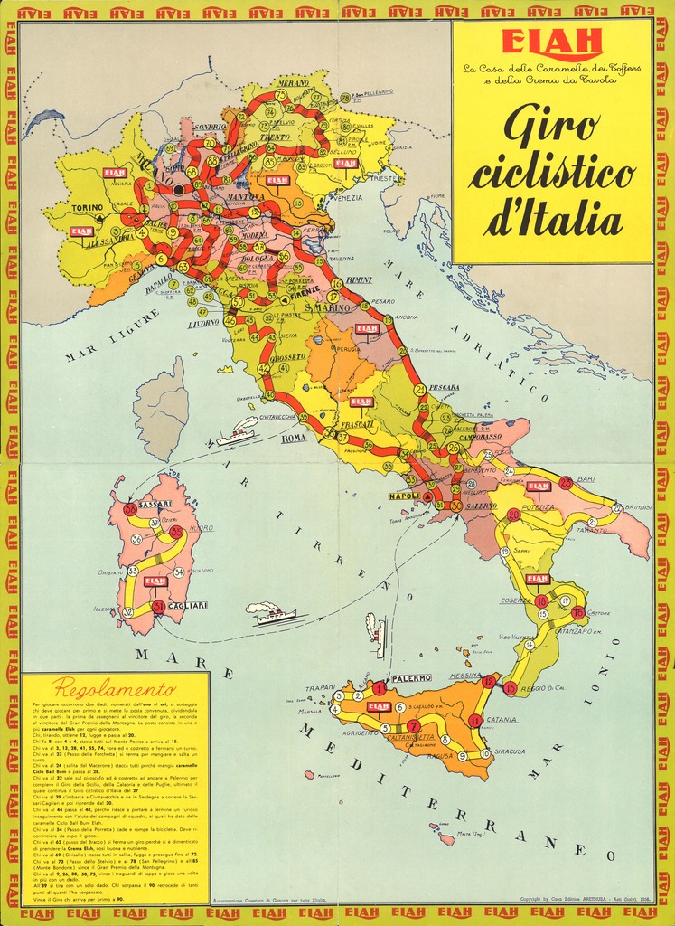 The board is made of light cardboard and measures 58 x 42 cms. The main route (red route on the game board) follows the stages of the 1956 Giro d'Italia, but riders that fall on some spaces are force to take a longer (yellow) route, so that the game covers all Italy.