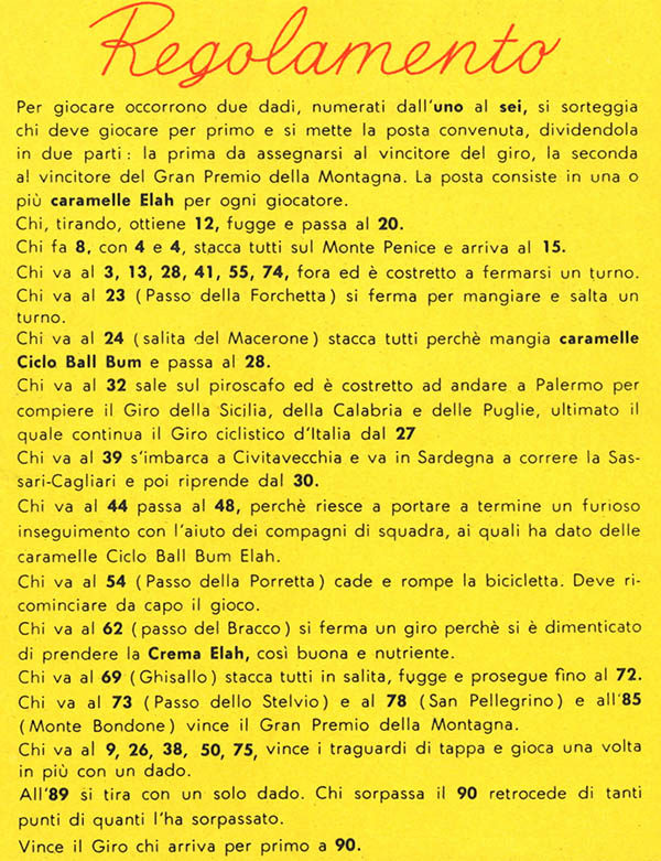 The game, of course, is a simple roll-and-move game, played with two dice. Players have to put one or more Elah candies in the common pot and the price is divided evenly between the winner of the Giro and the winner of the mountain classification. While the former is clearly determined by the rules (first rider to reach square 90 by an exact throw), the king-of-the-mountain rules are not so clear. The rule say that "whoever falls on square 73 (Stelvio) and 78 (San Pellegrino) and 85 (Monte Bondone) wins the Gran Premio della Montagna". What if no one falls on these squares, or not on all of them?