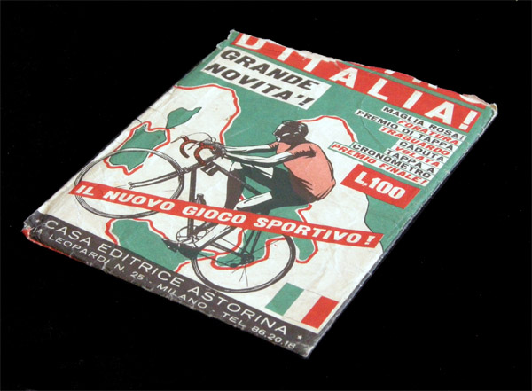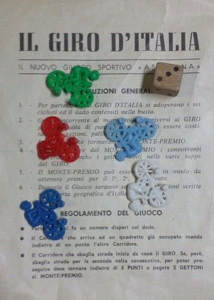The clue for dating the game is the picture of the rider on the bottom right corner. Though the picture is not too good, I would say that it is Gastore Nencini, winner of the 1957 Giro d'Italia. My guess (and it just a guess) is that the game features the winner of the last edition of the Giro, in which case it might be a game made for the 1958 season.
