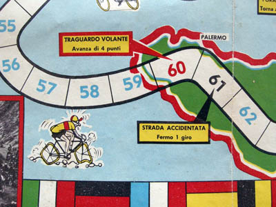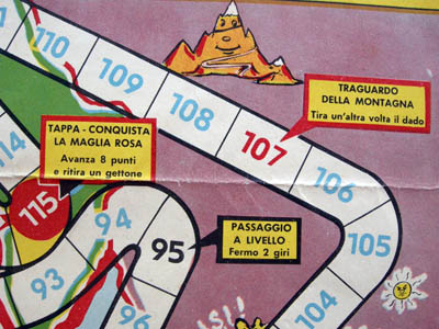 Judging from the information on the envelope, the game looks like a quite complete one, including sprints, time trials, prices for each stage, etc, but it is not. The time trial is that players who fall on th time trial square get an extra throw, or that the maglia rosa square just says "move forward 8 spaces and withdraw a counter". My favourite rule is "Forunculosis: Miss one turn" (square 68).