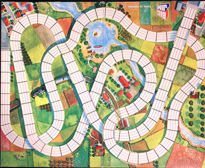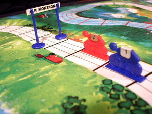 Big Jim is so strong he even takes part in the Giro! (This is how the rules of this game start). Leaving Big Jim aside, this is a nice game with two big two-sided boards, which makes 4 different tracks: 2 mountain stages, one time-trial (enĄding in a stadium) and a long flat stage (4th picture: notice the incredible design of that one: try to follow it!)