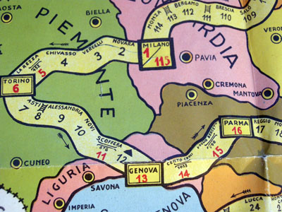 PS: If I had examined the board when I wrote the paragraphs above, it would have saved me some work. The game follows the stages of the Giro of 1948... It can be assumed that it IS from 1948.