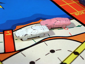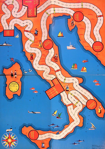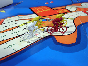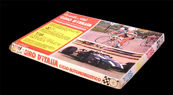 Double purposed Italian game. A cycling race and a car race can be played on the same board. Both games are quite simpleThe cycling game features three teams of two riders (whereas the car race features 6 independent cars) and the race consists of eight stages, including a time-trial. Points are awarded to the first three riders in each stage, but not all the stages award the same number of points. Flat stages award 3, 2 and 1 point, while harder mountain stages award 5, 4 and 3. The final stage awards 7, 6 and 5 points. Intermediate sprints also award points.