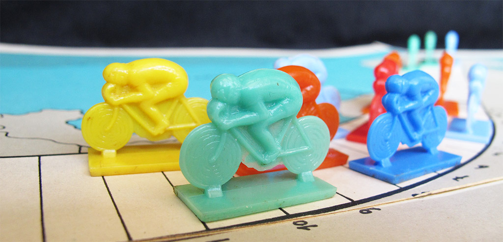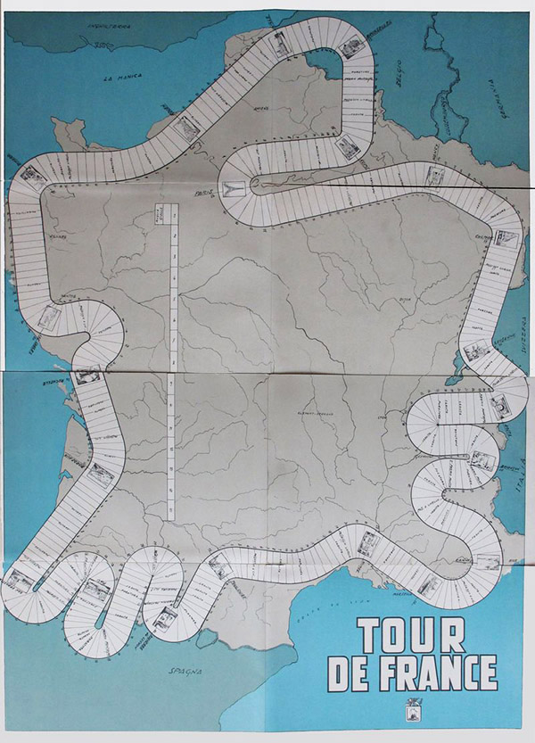 The course of the Tour is followed counterclockwise, starting and finishing in Paris, and the stages represent almost exactly those of the 1949 Tour de France, including a stage in San Sebastián, which was the first stage finish in Spain (and there would not be another until many years later). However, there are a couple of differences with the 1949 Tour: the stages at Boulogne Sur Mer and Saint Malo have been replaced by Lille and Dinard. Since these two were part of the Tour of 1950, my guess is that the board design was completed sometime in 1950 but probably started in 1949 (or, at least, the designer had the information of the 1949 Tour on the desk).