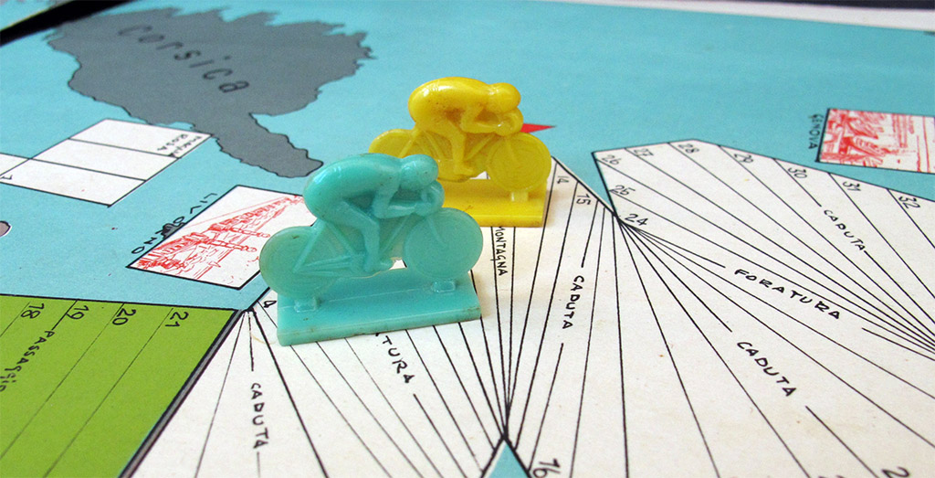 Besides, the board includes the usual race incidents where riders miss a turn, go back some squares or even return to the beginning: foratura (puncture), passaggio a livello (level crossing) and caduta (fall). On the other hand there are some positive "premio de la montagna" (king of the mountains) squares in which the rider who falls on them and all his team (!) move 9 squares forward.