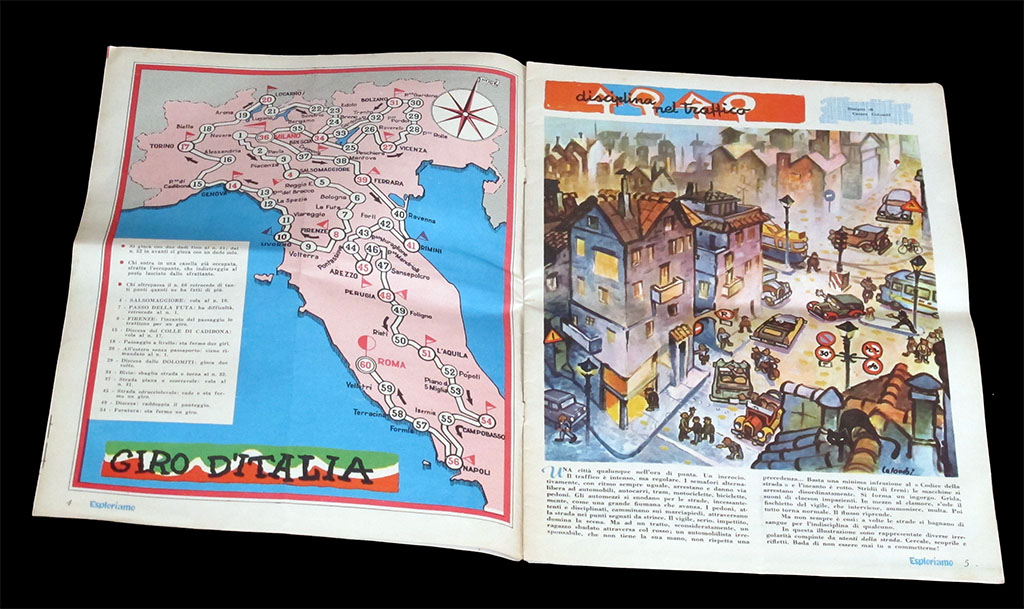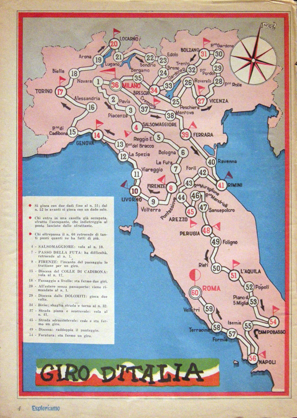 Giro d'Italia game featured in the february 15th, 1959 edition of the children's magazine Esploriamo. Years ago I only had a copy of the game without the rest of the magazine (see below). It was pasted onto cardboard, so I could not even see the opposite page. Of course I could read "Esploriamo" and the page number ("4"), but it has taken me a few years to find the magazine. Here it is at last.