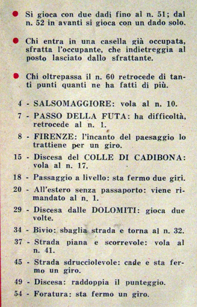 When I did not know the origin of this game I wrote, confidently: "[this game] is easy to date, since it follows the stages of the 1950 edition of the Giro". Well, surprise! Although it is true that the game follows the stages of the Giro d'Italia of 1950, this only proves that the game was made later than that. Of course a nine year delay is very unusual. Maybe the game was meant to be published some time before, or maybe it actually was, and this is is a reprint of a previous game, who knows.