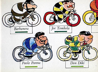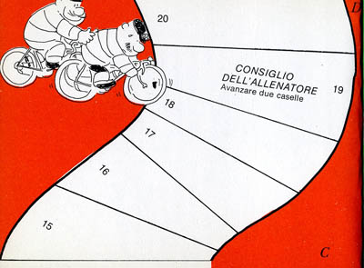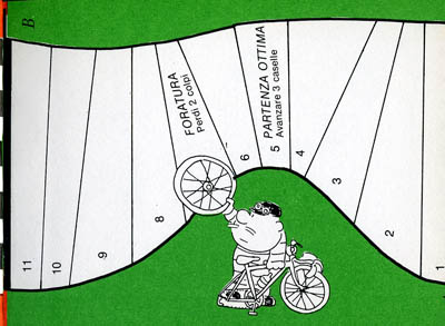 Small italian cut up book. It just measure 16x12 cm. You are supposed to cut it (including the cover and back cover, where there are two riders. When everything is cut (no, I did not cut mine, I just scanned it), you will have 5 teams of 2 riders (plus an extra rider in case you lose one), and twelve two-sided track elements, with which you can play two different races.The green track is used for the individual race (one cyclist per team) over a course of 108 squares. It is played with a dice (a cut-up spinner is also included in case you don't have a die), and with a six on the die you get an extra throw. As is usual in this kind of games, some race incidents or advantages are incribed oin some squares. The only special rule is for the level crossing. When a rider arrives exactly on the square 74, the crossing is closed (you place the train accross the track) ans stays closed for three turns unless the player who is waiting throws a 1 on one of these turns.