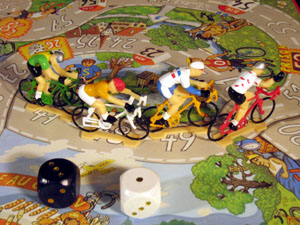 Generally, when I say that a cycling game is "a game of goose" I mean it is a dice game with just one rider per player, and no possible strategy. You throw the dice, you follow the rules and that's all. In "Le Guidon D'Or", of course, the analogy goes much further!