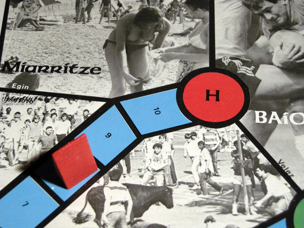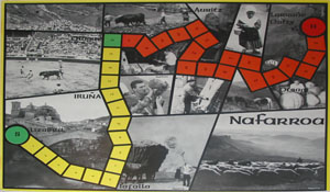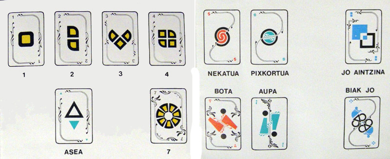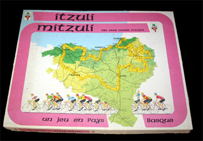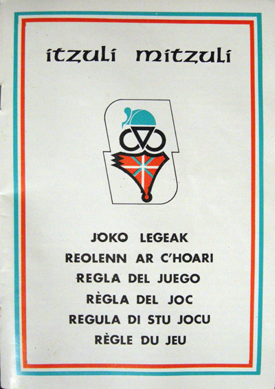 Beautiful rare game produced in the Basque country in the 1970s, with an important nationalist reivindication component. There are six boards representing the seven territories (Behe Nafarra and Xiberua share a board) reivindicated by Basque nationalism. The rules are in Euskara (Basque), Breton, Spanish, Catalan, French and another language I have not been able to identify, but is probably Corsican. The components of the game are quite geometrical: triangular wooden pegs represent the riders and the graphics on the cards are almost abstract. The rules, though, are disappointingly simple.