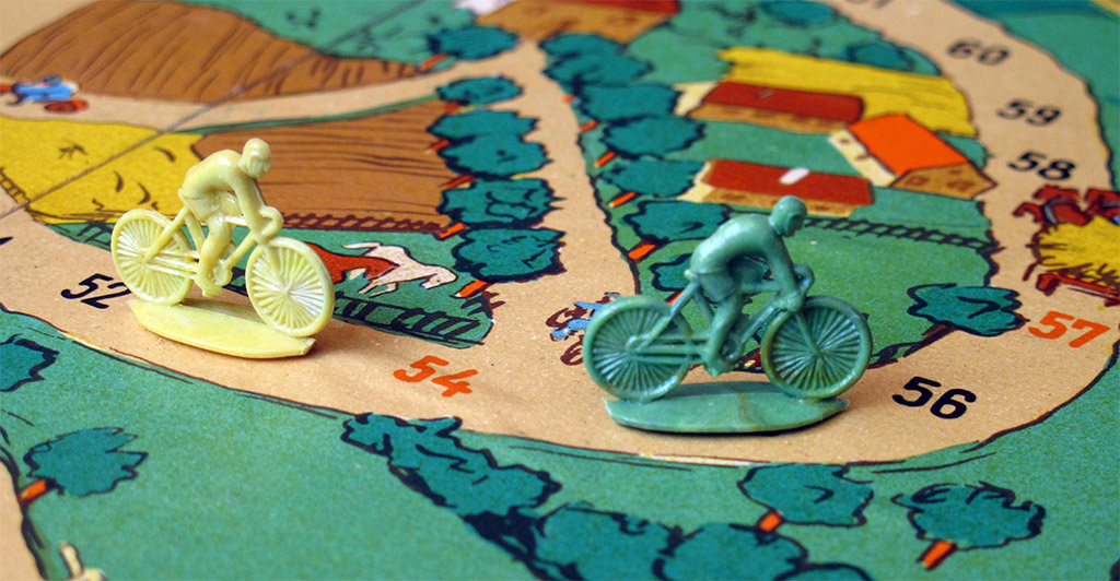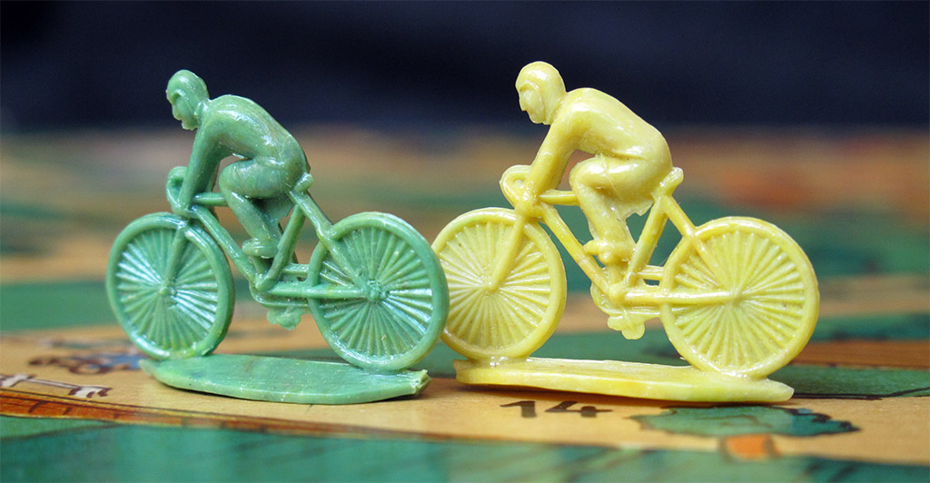 Though the rules say the game is for 2 to 6 players, there are only two cyclists left (and no original die). They do not look like cyclo-tourists, do they? I would not be surprised to find another hungarian cycling game with the same riders.