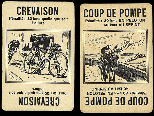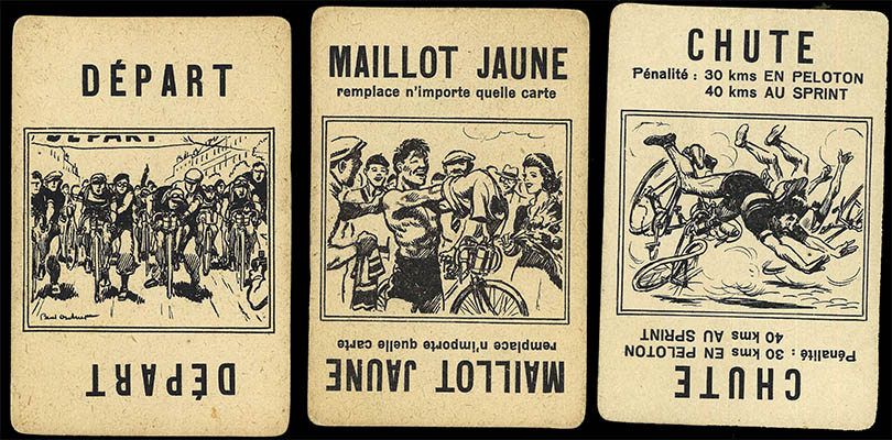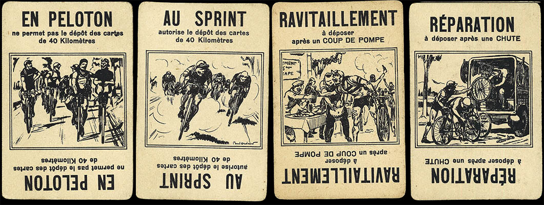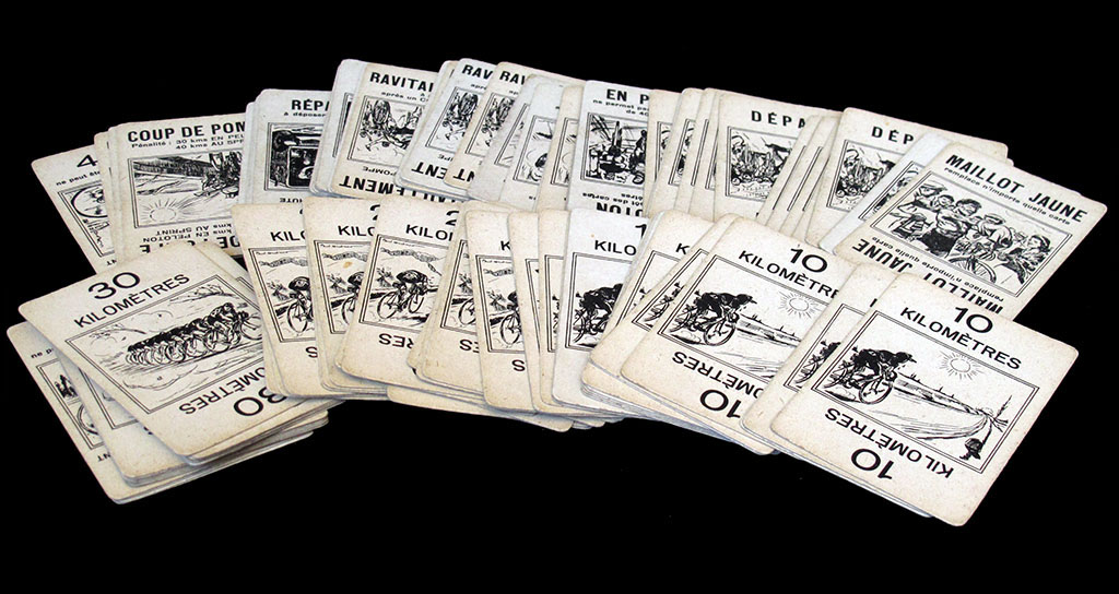This is a hard-to-find Mille Bornes-type Tour de France themed card game. More specifically, it's rules are based on the game Touring, which is the game that actually inspired Mille Bornes. (The main difference between these games is that Mille Bornes included the "Coup Fourré" rule which was not present in Touring).