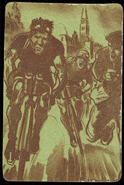 Some of the images in the cards ("Départ", "Au Sprint", "20 Kms", as well as the picture on the back of the cards) are signed. After some research I have been able to identify the illustrator as Paul Ordner (1901-1969) (*). In case you want to know more about his work, there is a book recently written about him by Philippe Aurousseau: Paul Ordner. 40 ans de déssin sportif, humoristique et politique (Éditions de l'Oncle Archibald, 2014). There is also a chapter on Ordner in Jean-Michel Linfort's Le grand livre des illustrateurs, des dessinateurs et des caricaturistes du Tour de France (Cheminements, 2008).