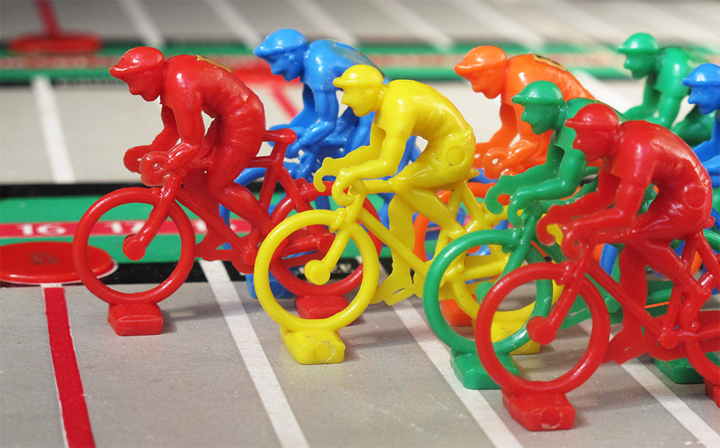 On the other hand, it is compulsory to move with at least one die the last rider in the race. What is worse, if a rider spends three consecutive game turns in the last position and is unable to overtake at least another rider, he is caught by the broom wagon and must leave the game. He will not take part in the following stages either. When the first rider crosses the finish line, the two last players in the race (indepoendently of which team they belong to) will also be eliminated if they are not able to cross the finish line in one throw (with two dice). Furthermore, some riders can be eliminated as a consequence of falls. A team that has less of three riders will not start the next stage(s).
