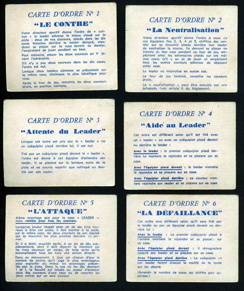 Every player receives a set of six cards with "orders fcrom the team director". The 4 sets of cards are identical, and tend to favour having the leader of the team ahead of the other riders. "LEADER" squares also favour the team if the leader is in front. So players will try to have their team leader in the front of the race, even though it is not important which rider in the team crosses the finish line first. Nevertheless, there is a rule that allows a team that has 4 riders on the same square to attack, so the leader must be ahead, but maybe not that much.