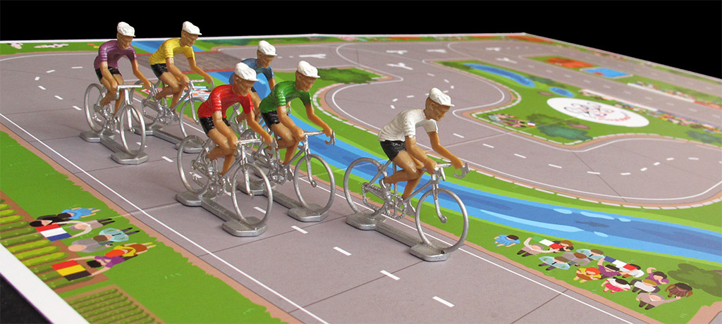 Each team is composed of three riders (Leader/Climber, Rouleur, Sprinter) with different abilities. Provided stickers should be pasted to the riders wheels in order to identify them. Don't look for them in the pictures, though: I generally unpack/cut/paste all the elements of games as if I was going to play them (though most of the time I do not play them for different reasons). However, this is not the case. For the pictures I opened only on set of riders. That is why you only see one rider from each team and why these riders do not have pasted stickers.