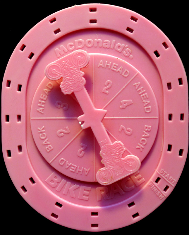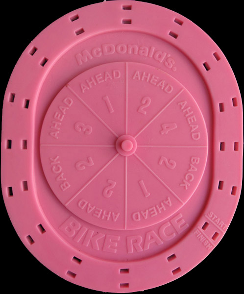 This small game (10 x 8 cms aprox) was a McDonalds' bonus somewhere in the USA sometime in 1984. For lack of a better idea, I will include it under track cycling games. After all, the track is oval and there are no mountains.