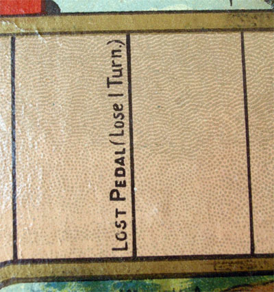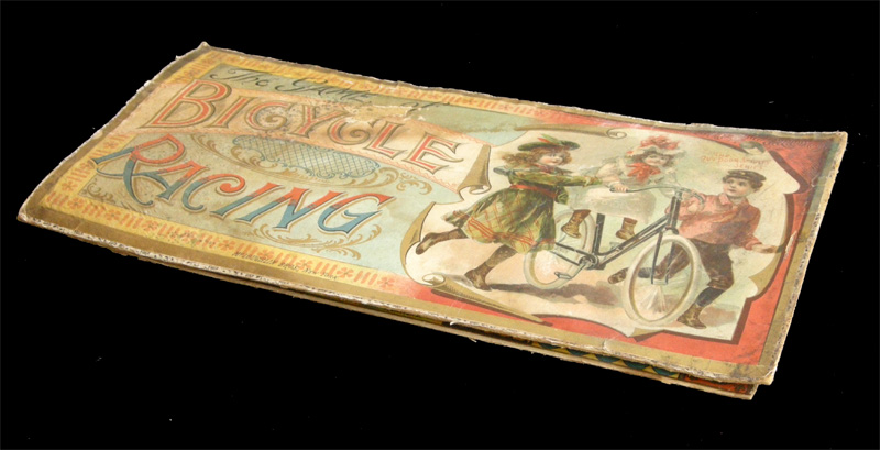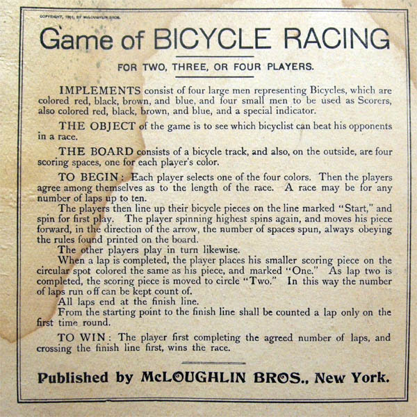 This game is quite similar to the McLoughlin's 1891 classic Bicycle Race. Though there are at least two other games by McLoughlin with similar titles documented (Game Of Bicycle Race, 1895, and Bicycle Racing, 1900), this one seems to have been overlooked by historians (probably mistaken for his classic "older brother").