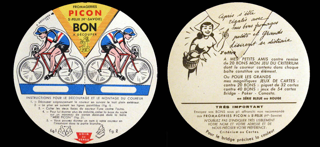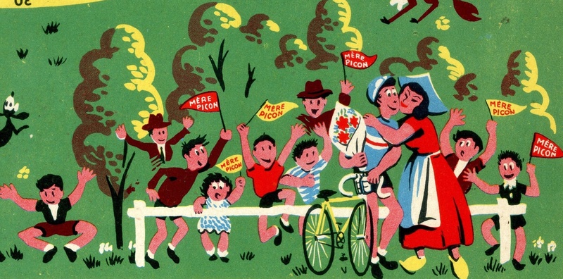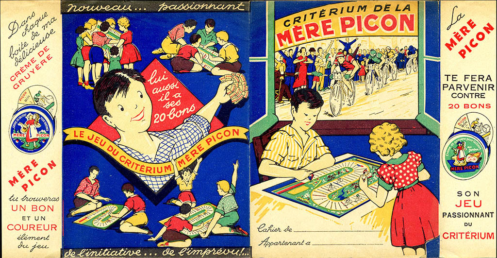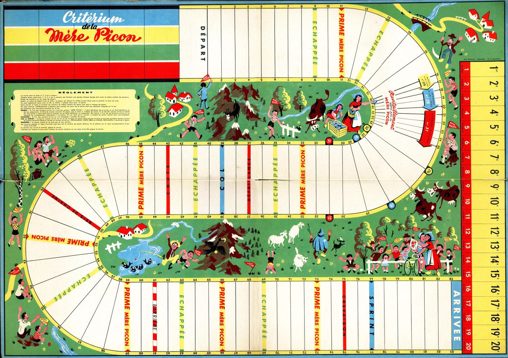 Regarding the game, she told me that Mère Picon (who were quite involved in advertising goodies as card games or blotters) asked Jacquet to make a game inspired by the Criterium du Dauphiné, since the race (created in 1947 created by the newspaper Le Dauphiné Libéré) passed not far from the headquarters of La Mère Picon in Saint Félix (and arrived in Grenoble).