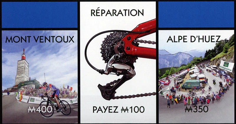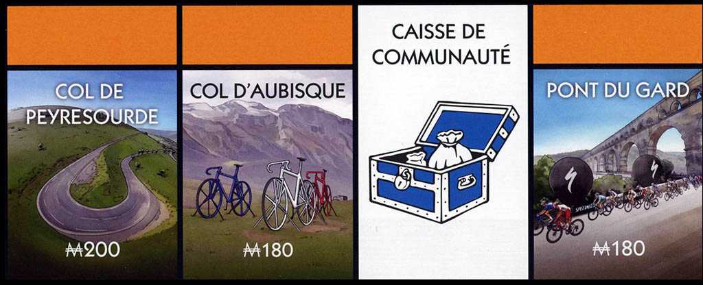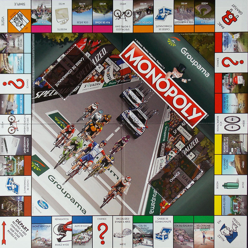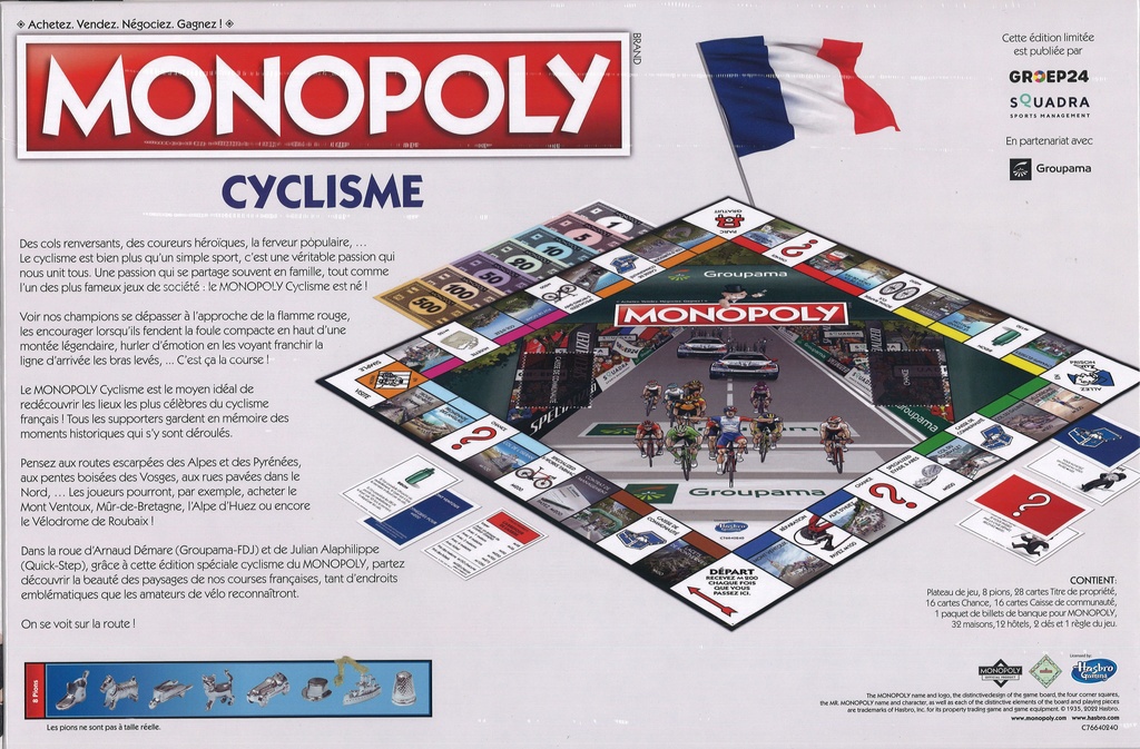 The cycling-themed game of Monopoly released last year must have been a success, since here we have a new version aimed at the French market. This game has been released by the same (Belgian) group, though this time in partnership with Groupama, and is very similar to the other (same size, same materials...). You may want to refer to the Monopoly Koers description for the details. The main difference is that, in this game, what you sell and trade are spots related to French cycling races, including, but not limited to, the Tour de France. And that the rules of this one are only in French.