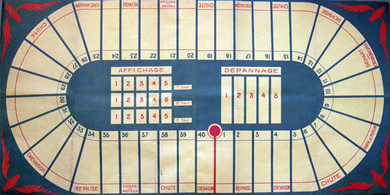 The fifteen fields under "Affichage" on the left of the pelouse are most probably used to count the laps (thus the race would last three laps) while the 5 long rectangles on the right labelled "Dépannage" fit the cars too well not to be a garage where cars stay some after falling on one of the "panne de moteur" squares."Départ des Entraineurs", obviously, is the starting square for pacing cars (while cyclists probably start at the finishing line). So it is obvious that there must be a movement rule for non-paced riders and another for paced riders (and maybe even one for cars if not followed by a cyclist).