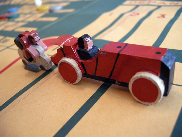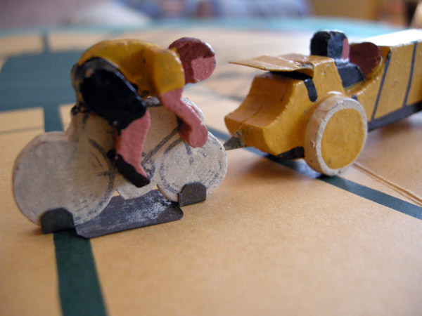 Unfortunately we do not have the rules of the game. All we know is that there are 5 teams composed of a car and a rider, one wooden counter per team, and that the game is played with a (single?) die.