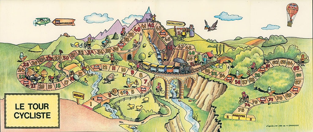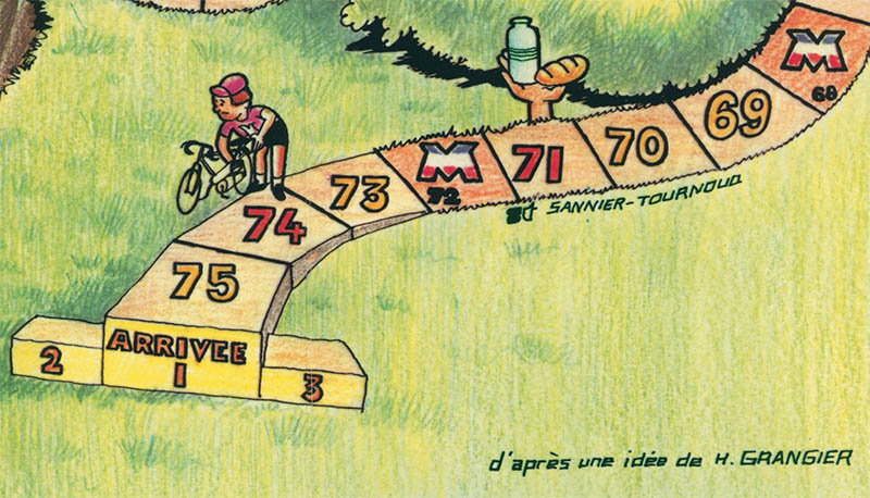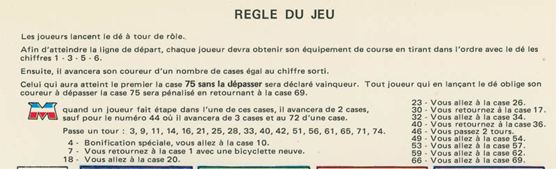 This is a game issued by Cycles Motobecane in 1979 as a souvenir of the "assemblée générale ordinaire des actionnaires". I assume it was offered to Motobécane shareholders who attended to meeting, along with an eight-page booklet featuring vintage cycling images. I do not know how many copies were printed, but I guess most of them were either given away to kids who destroyed them by use (the game is not really meant to last) or simply forgotten in a drawer. This makes the game quite hard to find nowadays.