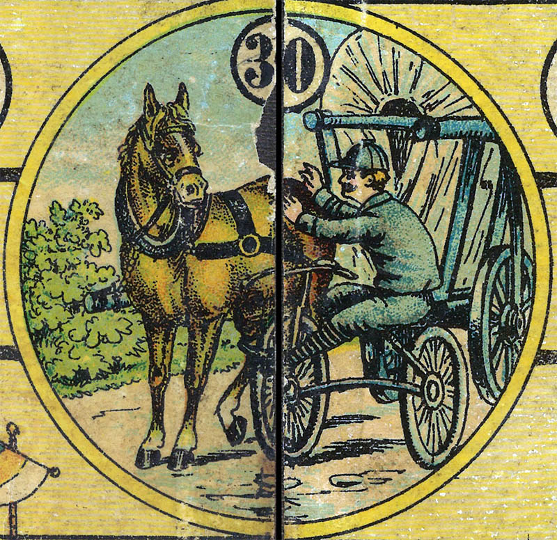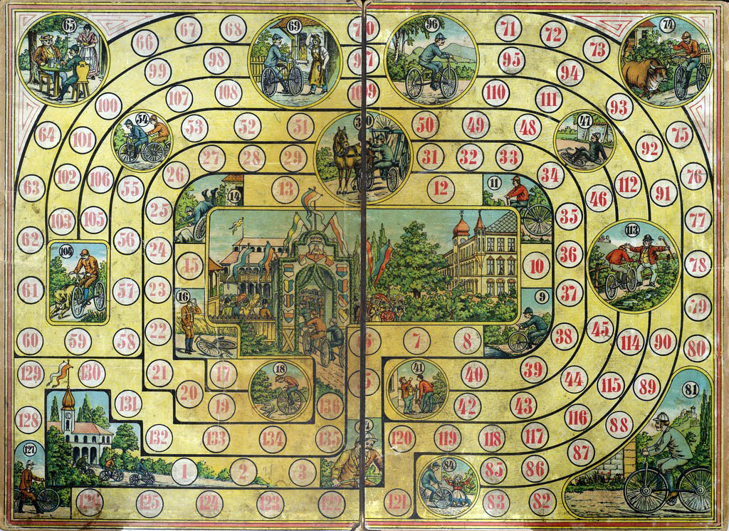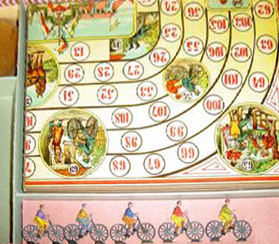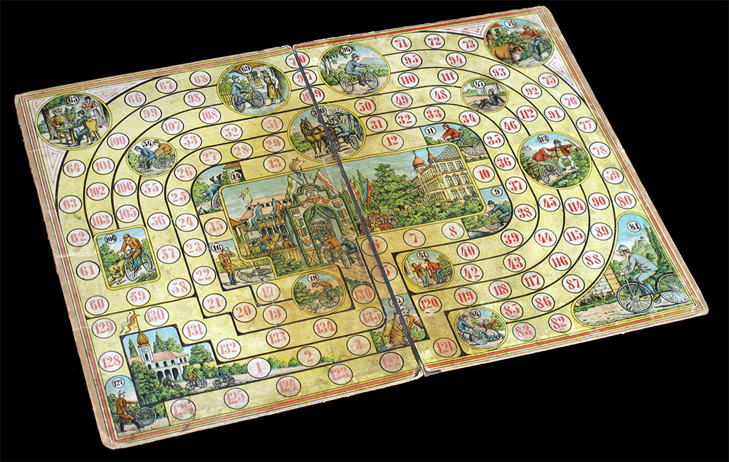 Two-fold German board, measuring 53 x 38 cm. There is at least another version of the game (see below) in which the board is four-fold. This game is an interesting example of how the high wheel bicycles (aka Ordinaries or Penny-Farthings) were replaced by modern bicycles. As I wrote in my comment on this other game, this happened around 1890.