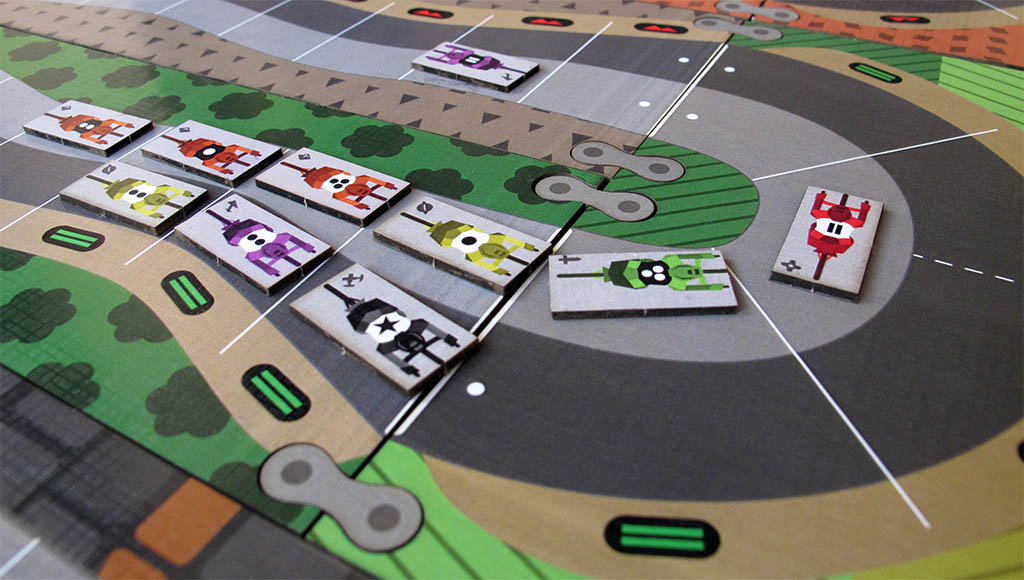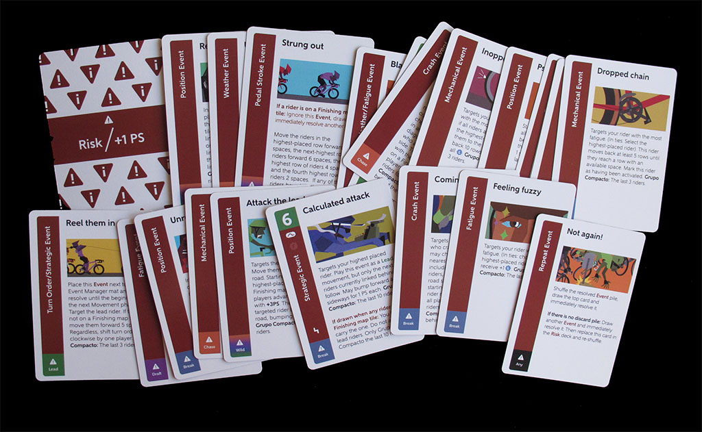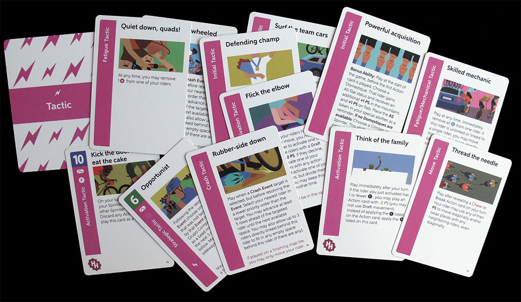 From the game's presentation on Kickstarter: "Your goal is to get your entire team of racers across the finish line in as high a position as possible because your score depends on the aggregate time of your team. But in order to have a shot at it, you must react in the moment, because your opponent's racers will be following your moves, and your racers will be following theirs. Each player draws from their own deck of cards and has the ability to lead (or pull) a line of racers, chase (or follow) the line, draft in between riders (follow AND pull) or make a solo break. It's important to know that every time you move a line of racers, you’ll probably be moving your teammates — as well as your opponents!"