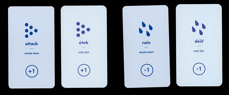 The red event cards apply to individuals, the blue ones to all members of the selected team. Unlike the terrain cards, these event cards can be applied to anyone in the peloton: to your own riders as well as to riders of other teams. Needless to say, you will generally apply the positive cards to your own team and the negative ones to another.