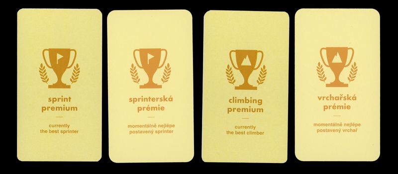 So, you will try to have all the riders in your team as far up the peloton as possible. Furthermore, whenever a player draws a premium card, the current order of riders in the peloton is immediately evaluated. There are three such cards, two for sprinters and one for climbers. The most advanced rider in that category receives one bonus point for his team. In the rare case where there isn't any sprinter or climber in the peloton when the card is drawn, the award is forfeited.