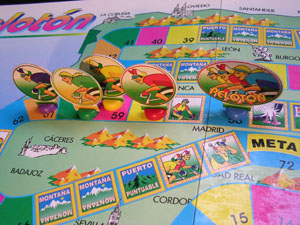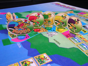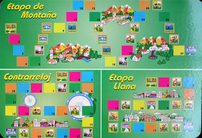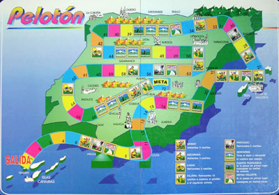 Another Spanish game capitalising on Miguel Indurain's success. Although the box states "2 games in one", referring to the reversible board, there is not much about it, except a lot of Trivial Pursuit-like cards with questions about Spanish geography. The most interesting feature is the "peloton" counter, that moves one space at a time. You can even play alone against the peloton!