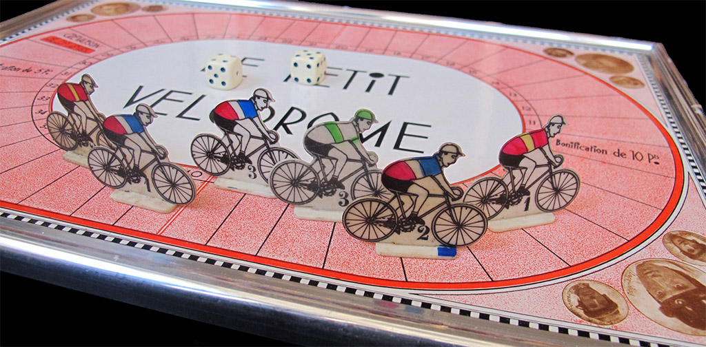 To date this game, our best clue is the set of riders depicted on the corners of the board. Though they have their names written beside the pictures, some are quite hard to read (luckily, they are the same riders in the three velodrome games, and they are easier to read on the bigger boards). Furthermore, while all these riders could have been fairly well-known when the game was produced, most of them are quite forgotten by now. However, I believe I have identified them all.Three of the riders (together in one of the corners of the board) are Tour de France racers Antonin Magne, René Vietto, and Roger Lapébie (unless it is his brother Guy Lapébie, it is hard to tell from the picture).
