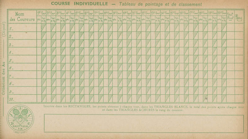 As is usual in track cycling games, different races can be played with it. For want of the rules, we will assume that the six aces stated on the Le Vel d'Hiv board are the ones included in the rules. These races are: elimination race, time trial, individual pursuit, team pursuit, motor-paced race ("demi-fond"), and Madison ("course à l'amériquaine). I guess there was a scoring pad for each of these races, but we only have three of them, and I have never seen the others. By the way, the three are marked "Criterium des As".