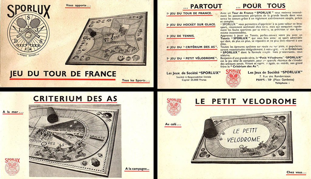 On the one hand, my friend Didier Maria has found not only different boards but also different scoring pads, the rules of the Tour de France game, and a leaflet by SPORLUX featuring three of the four known cycling games, plus two other sport games. By the way, part of the pictures featured on this page are Didier's.