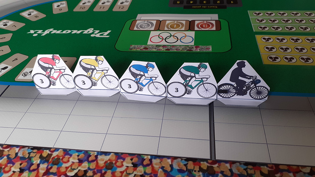You can probably do it better than me, at least judging from the picture above. I can also do it better, but then you would not have noticed the modification in the picture.Players throw both dice, but they can choose to use the result of just one of them. There are a couple of good reasons for not wanting to speed, the most obvious of which is to avoid crashes. As the name of the game suggests ("pignon fixe" means "fixed gear"), track cycling bikes do not have brakes, and since cyclists in this game cannot pass through occupied squares, excess speed can cause falls in case other riders block the road. This is an issue in crowded events like scratch races while, of course, will never happen in individual pursuit.