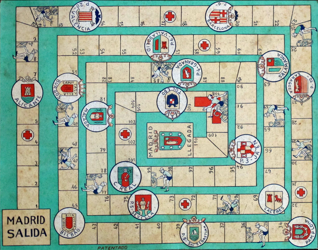 Rare old Spanish game. It represents a race around Spain, but it is not called "Vuelta a Espaņa", as one might expect, but "Pinchazo", which means "puncture". The name is quite odd. I can think of some reasons for it, but the most obvious is that this game may be previous to the Vuelta. One must remember that the Vuelta only started in 1935 (much later than the Tour, the Giro or even the Volta a Catalunya)
