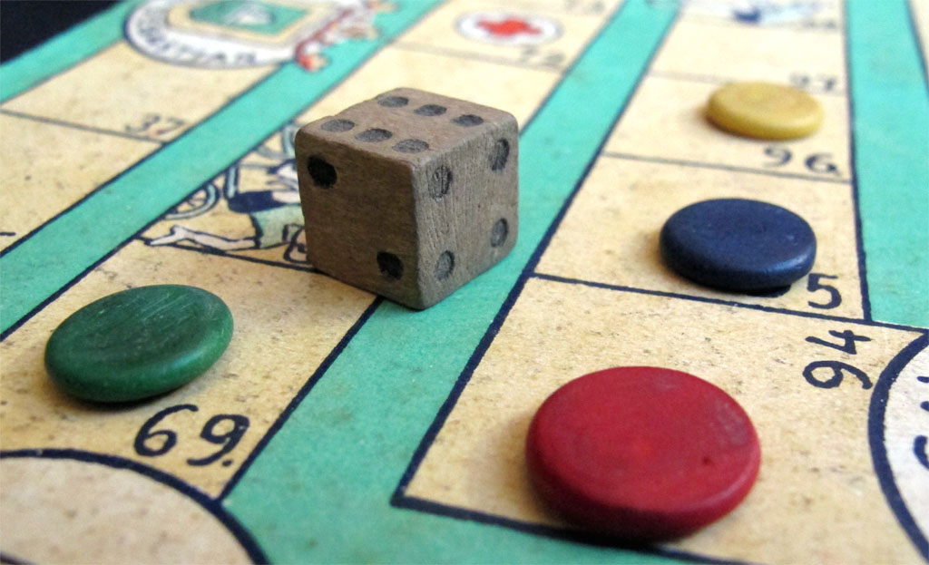 Unfortunately, the rules of this game have been lost. It is strange, since the wooden counters and the die look (and probably are) original. At first look one would say that this is just another game of goose, and it is probably not too different from a game of goose, but there are some mysterious elements.