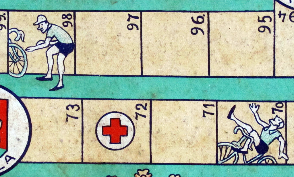 The game is composed of 110 fields (apart from the starting and finishing fields), 17 of which are cities, 6 are marked with a red cross, 7 are punctures and 6 are falls (one of them a double field (107-108) with a red mark. Of course the rules might just say that you miss one turn if you landl on a puncture, and you go back to the nearest red cross if you land on a fall, and it is quite probable that they say something similar.