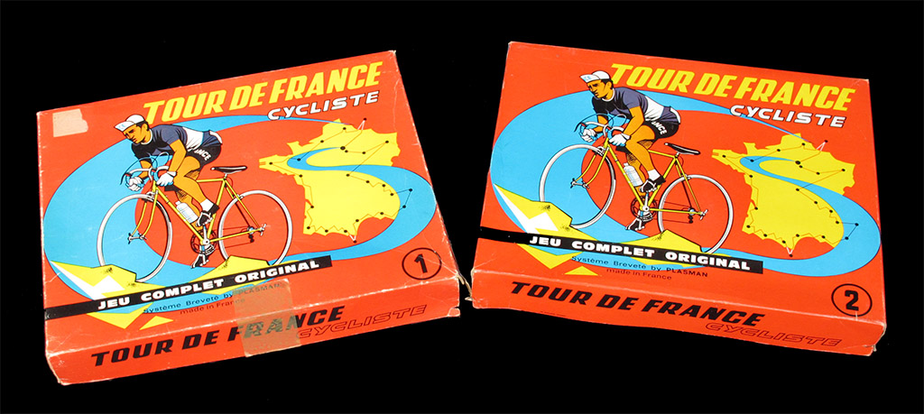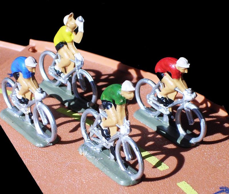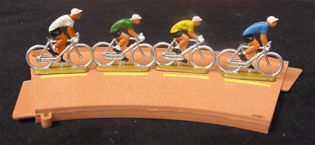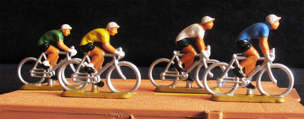 What I am not so sure is that you would have six riders in different colours. I have never seen the rider with the striped jersey ("maillot rayé") mentioned in the table. All the boxes I have seen contain a red, a blue, and a yellow rider, with the fourth rider either green or white. Didier's box has both, but still no striped rider.