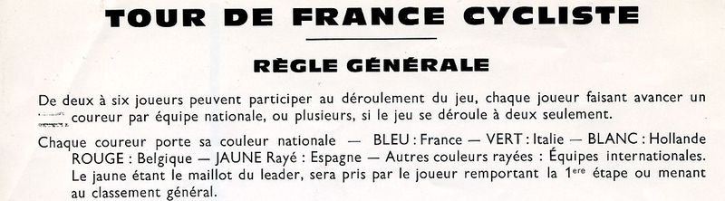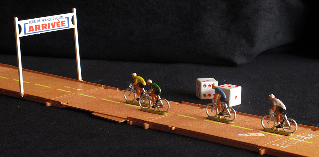 For all its beauty, the game is disappointingly simple. It is just a childish roll-and.move game without any tactical twist. The game fields are the dashes on the road (maybe the first game to implement them this way). During the climbs you subtract two to the throw of the dice, during the descents you add two, and that's all there is to it. The race incidents are equally simple: go some fields back or miss some turns.